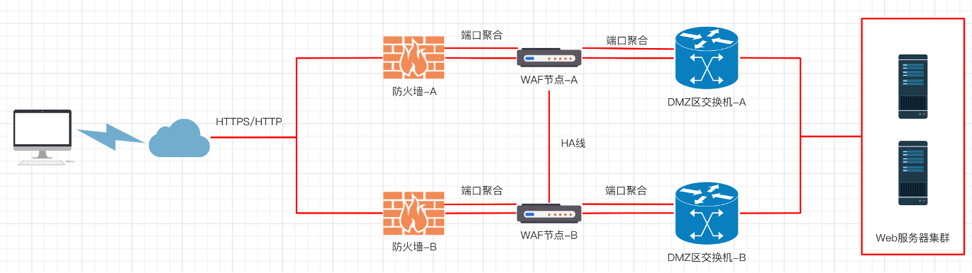 当部署网络中存在BONDING链路时,大部分情况下BONDING的两条线路都会跑流量,并且同一个会话的流量很可能会不在同一个线路上,此时两条线路上分别串联一台WAF配置HA,如果WAF是透明桥模式,那么将无法进行流量检测,但不会影响业务流量中断。如果是透明代理模式,则很大概率会发生TCP链接建立异常导致业务中断。(如有此类网络部署需求,可联系长亭技术支持进行确认。)