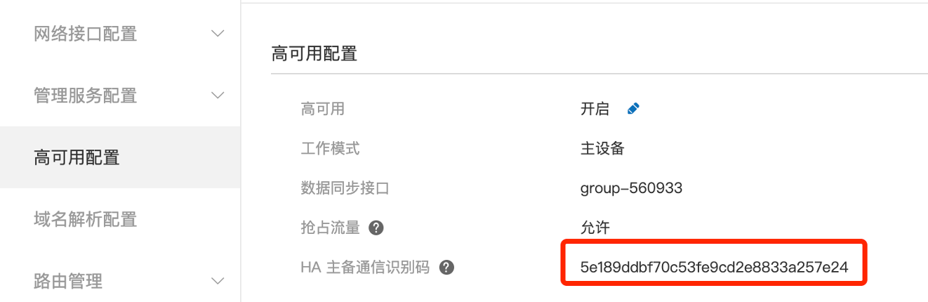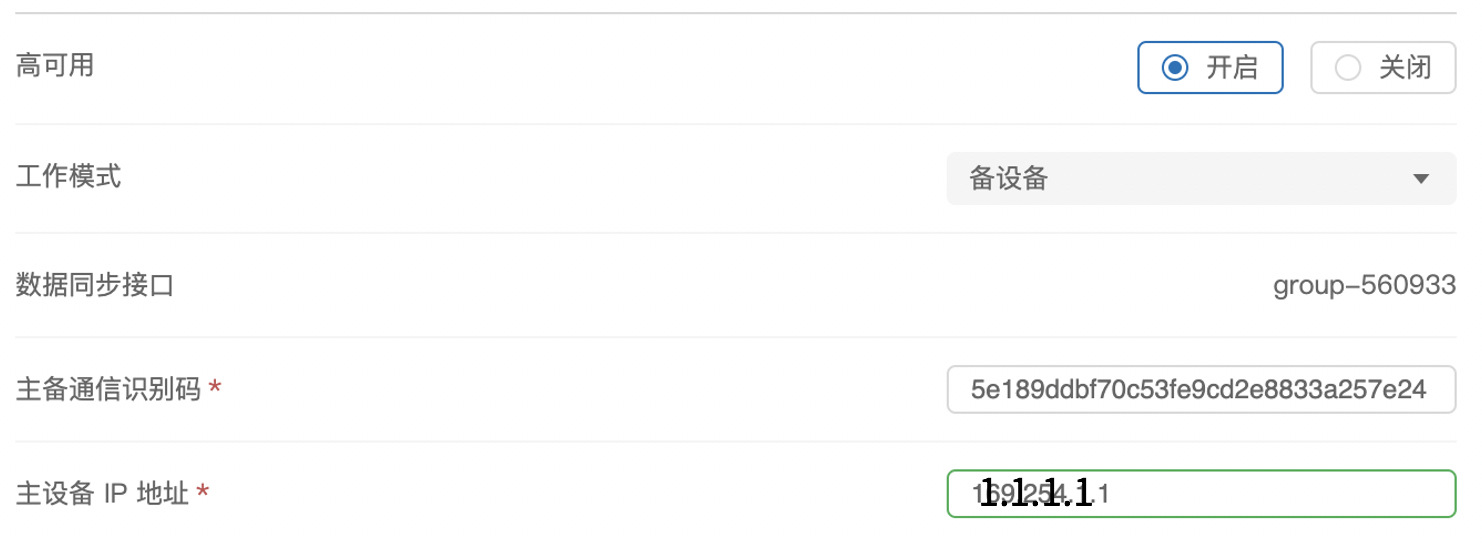 - 开启高可用配置,作为主设备,生成通信识别码;如果已经建立数据同步工作组,数据同步接口不需要填写。
