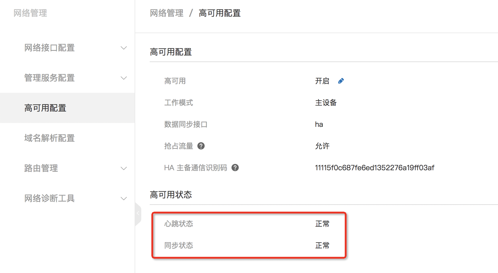 - 从WEB管理界面「网络管理-高可用配置」中可以看到心跳状态与同步状态,状态均为正常。