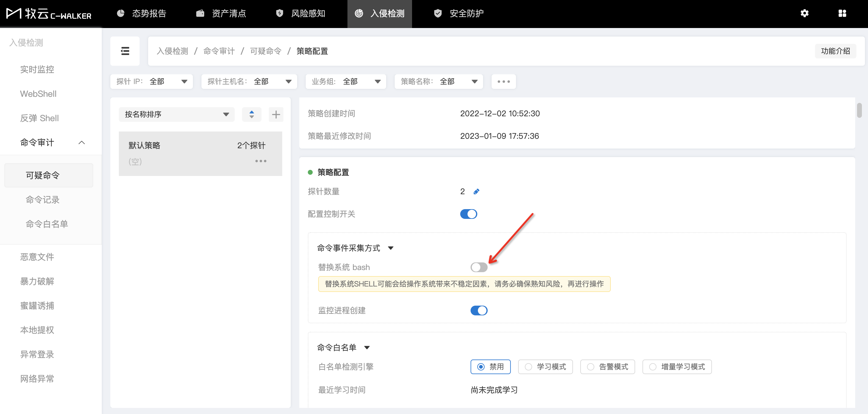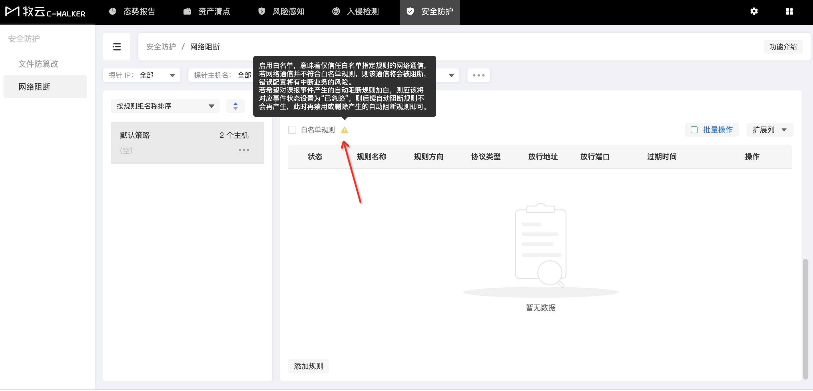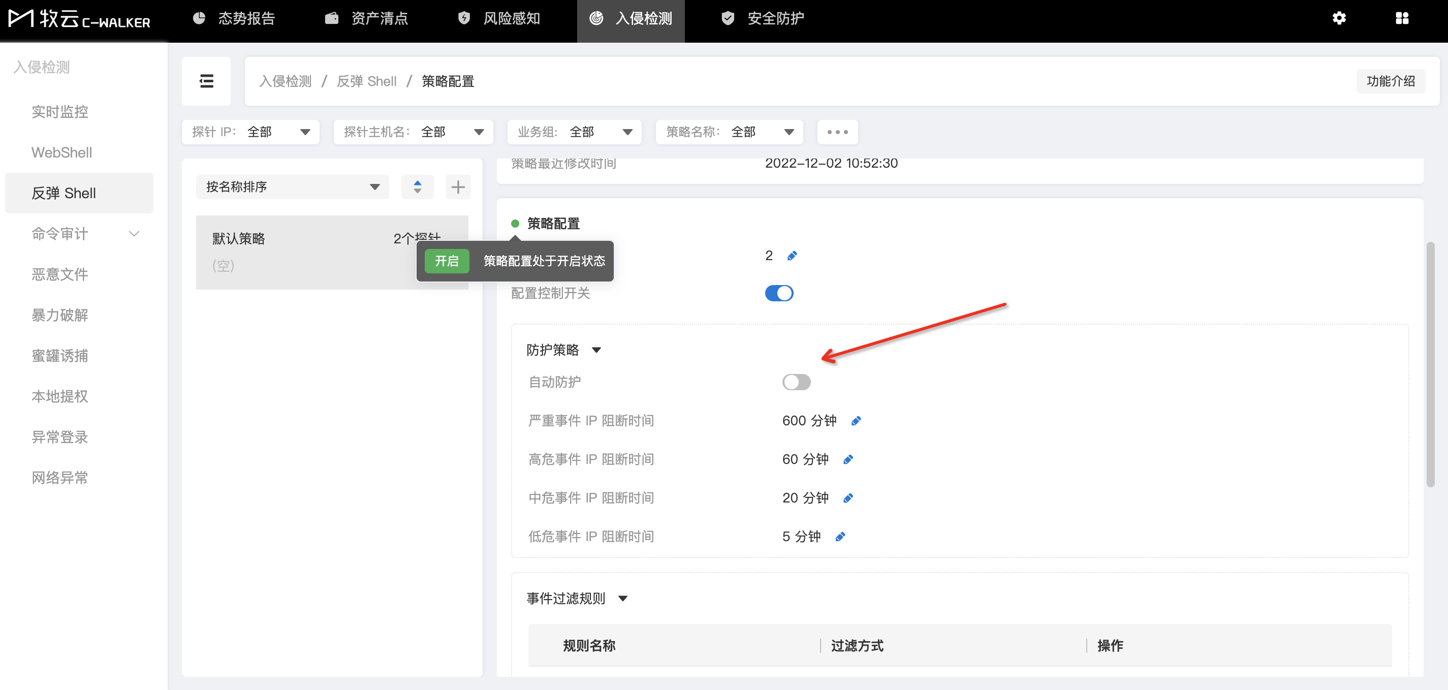 在对应的检测功能下,需要一段时间(建议一个月)内不出现业务误报的情况下才开启,不然可能导致业务被拦;手动配置网络阻断黑名单同理,需要先理清业务访问关系。