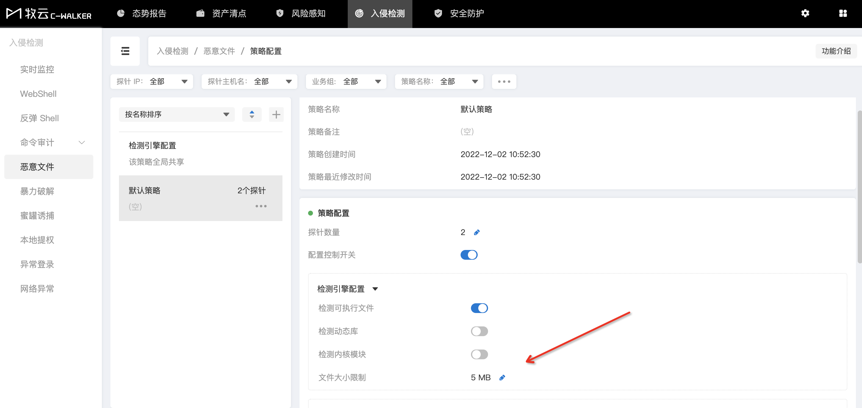 该限制默认是5M,需要调大时,不建议从5M直接调整到20M这种大跨步的调整,这样会导致之前5M至20M的可执行文件开始上传检测,探针较多时也会导致网络IO和磁盘IO激增;