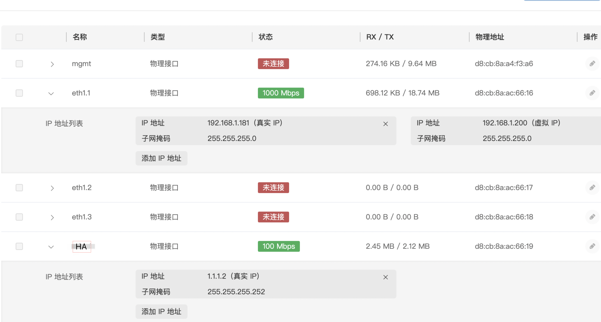 备设备配置业务口,例如eth1.1:真实IP为 192.168.1.181/24、虚拟IP为192.168.1.200/24;
