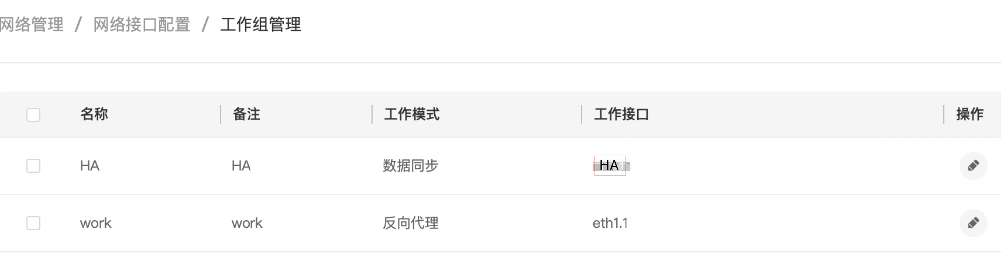 主设备配置第一个工作组为反向代理模式,选择业务口eth1.1(建议工作组名称和备注相同);