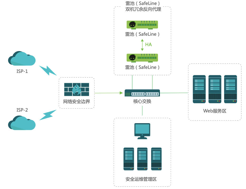 在硬件反向代理部署模式下,Web业务访问流量经雷池WAF反向代理至Web服务区,实现实时Web安全防护,不需要串联接入原先的网络拓扑。同时雷池WAF采用双机冗余配置,避免单点故障,提高业务可用性。