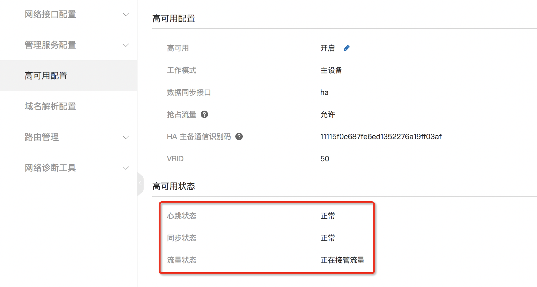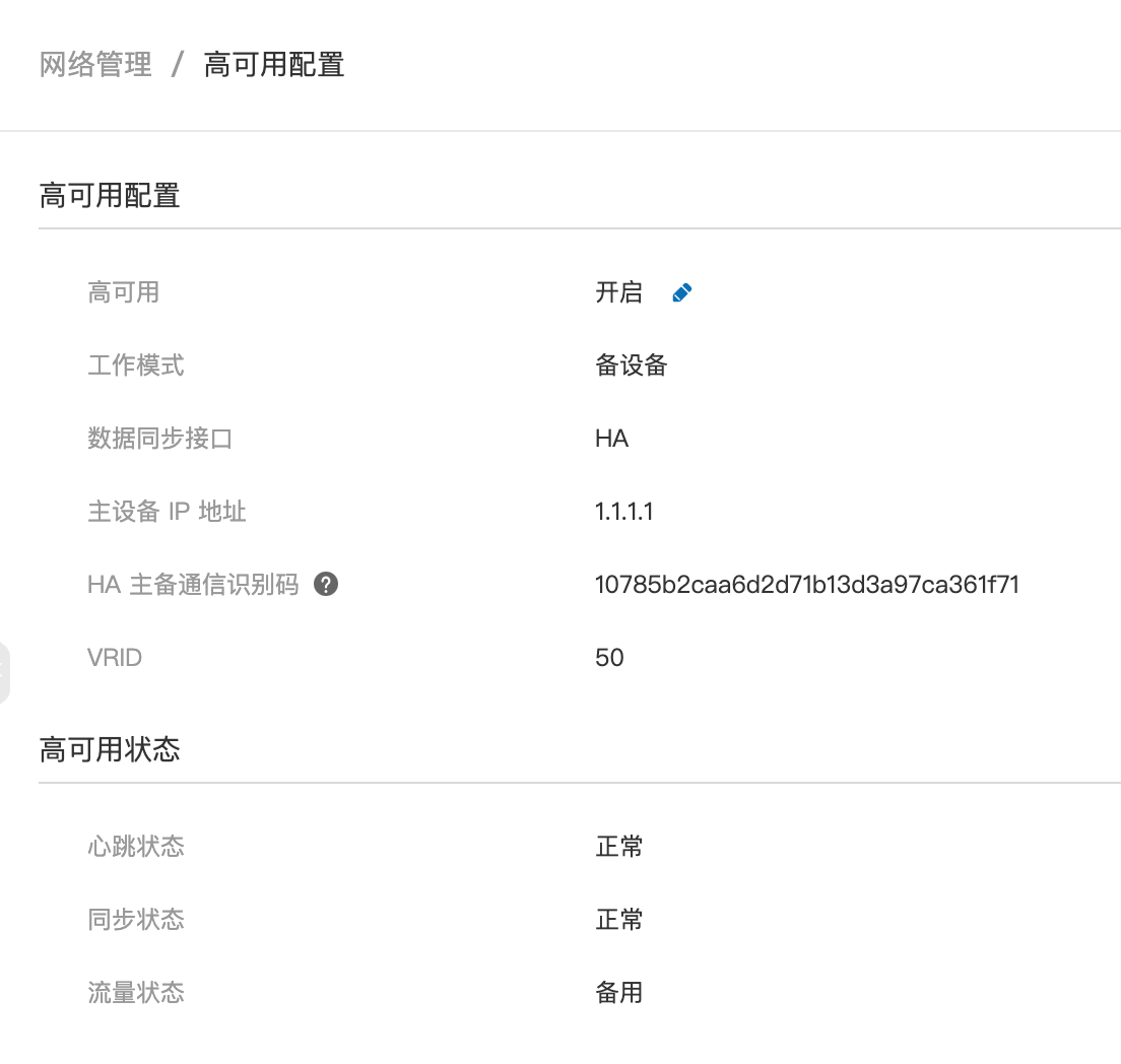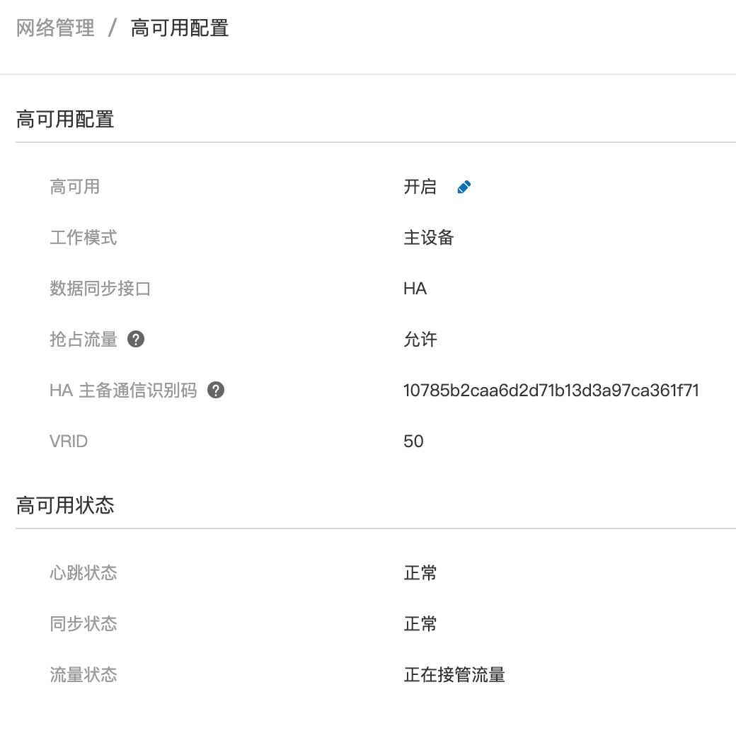 - 从WEB管理界面「网络管理-高可用配置」中可以看到心跳状态与同步状态,状态均为正常。