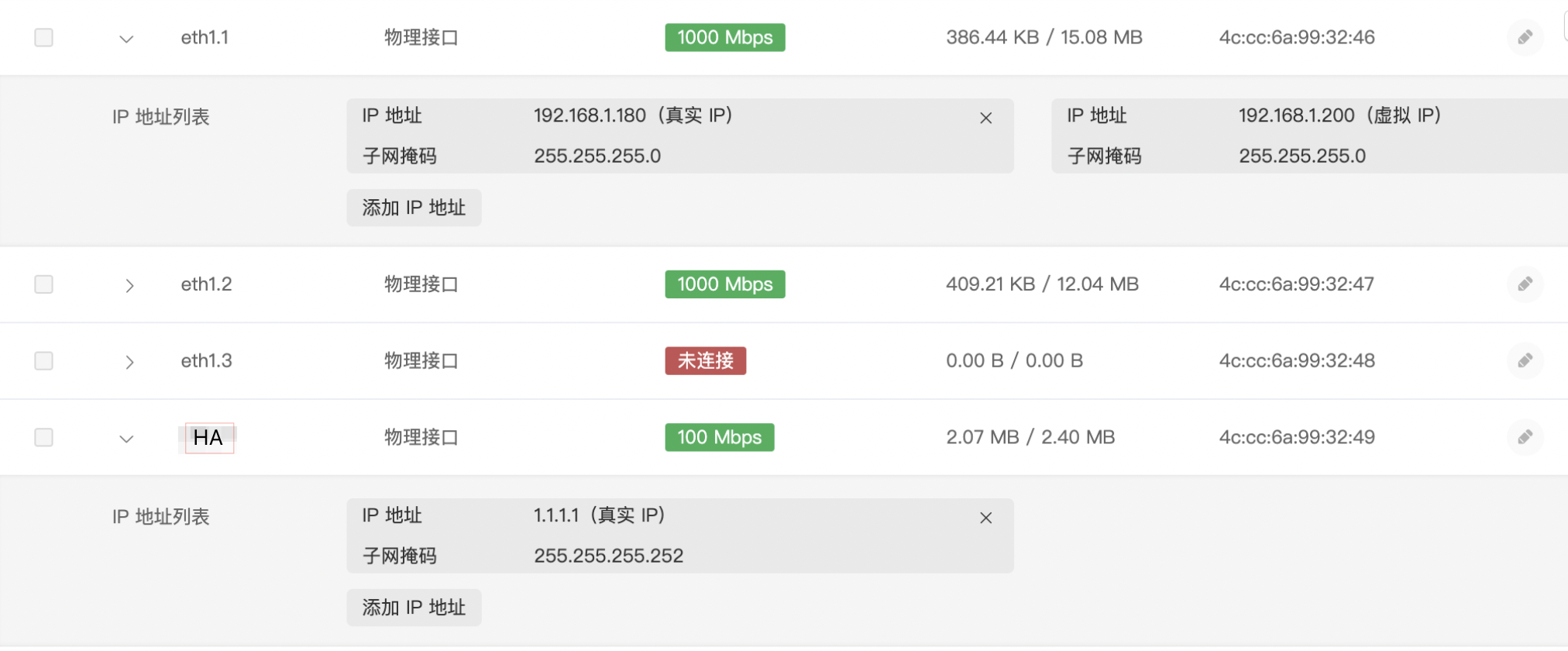 主设备配置业务口,例如:eth1.1,配置真实IP为 192.168.1.180/24、虚拟IP为192.168.1.200/24;(⚠️注意:如果业务口上需要配置多个VIP,请确保主、备设备配置的VIP一致)