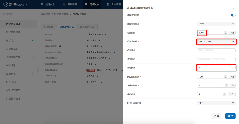 业务服务器健康检查:业务服务器健康检查功能能够辅助判断监听(保护)服务器的可用状态,确认服务器的可用性。常客户业务站点存在2台及以上的后端业务服务器,建议开启健康检查。