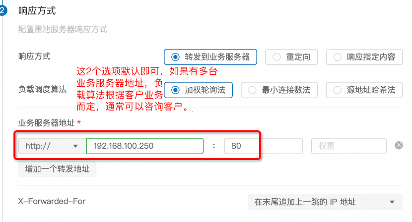 响应方式:配置请求响应(转发)方式,可配置为响应的业务服务器/重定向/指定内容三种方式,并按照对应的响应方式配置响应动作等。在配置了【转发到业务服务器】的响应方式前提下,需要配置对应方式下的一些请求处理以及相关配置选项。