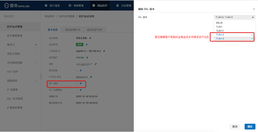 - SSL版本:该配置需要与站点的 SSL/TLS 协议版本要完全一致,支持的版本包括SSLv2、SSLv3、TLSv1、TLSv1.1、TLSv1.2、TLSv1.3,建议根据客户业务原本实际对外提供的SSL/TLS协议支持情况进行配置,编辑该站点,选择“基本信息”>"SSL版本"进行配置。