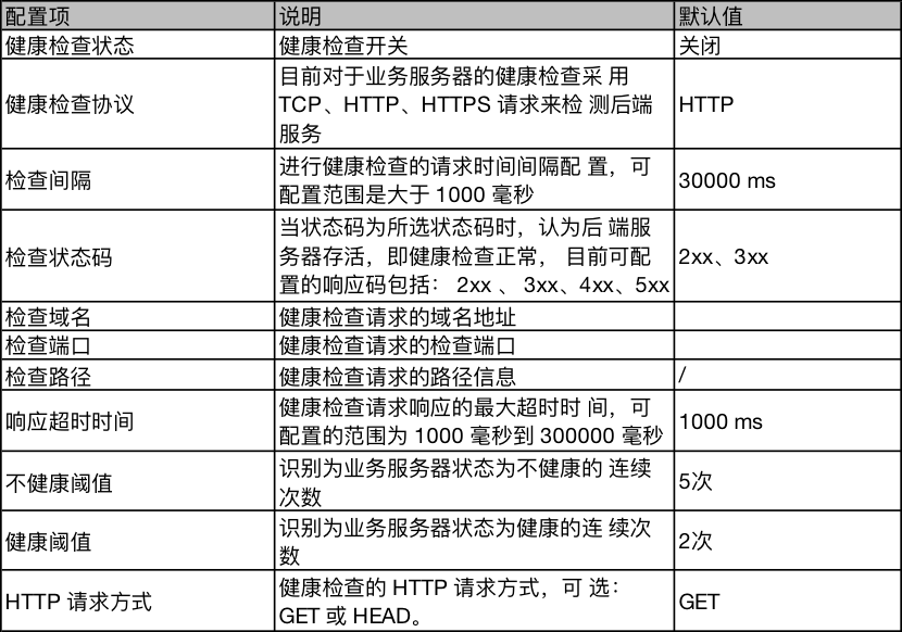 健康检查的协议,可以根据客户需求选择4层的TCP或者7层的HTTP/HTTPS协议,目的是为了检查后端业务服务器的健康状态。健康检查方式配置项说明如下: