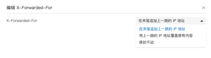 X-Forwarded-For:X-Forwarded-For(XFF)是用来识别通过HTTP代理或负载均衡方式连接到Web服务器的客户端最原始的IP地址的HTTP请求头字段。此配置提供三种X-Forwarded-For头部的配置选项,如图所示: