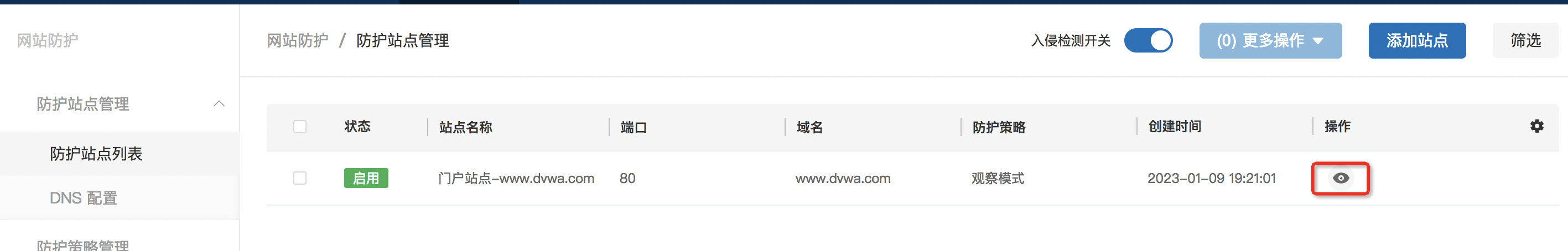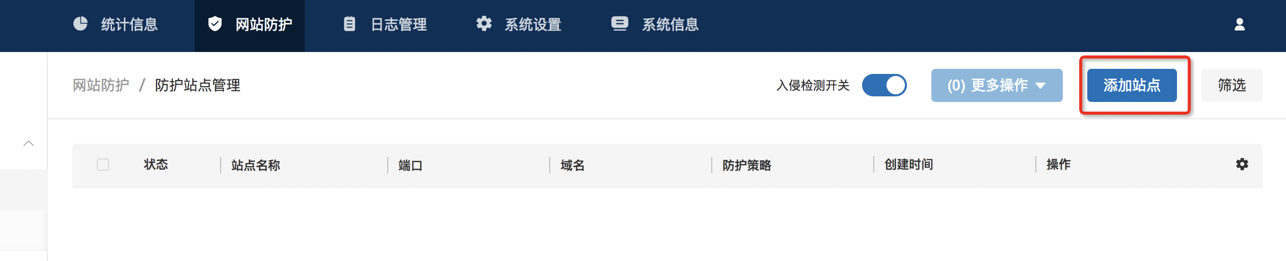 1、首先添加一个站点,点击“网站防护”>“防护站点管理”, 点击右上角添加站点,如下填写后,点击确定,创建站点成功。