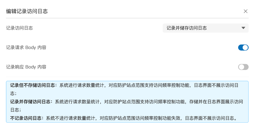 记录访问日志:配置WAF在检测统计时所记录的请求访问信息,WAF的访问频率控制、扩展插件都会调用访问相关的信息。该配置不影响攻击检测日志记录。