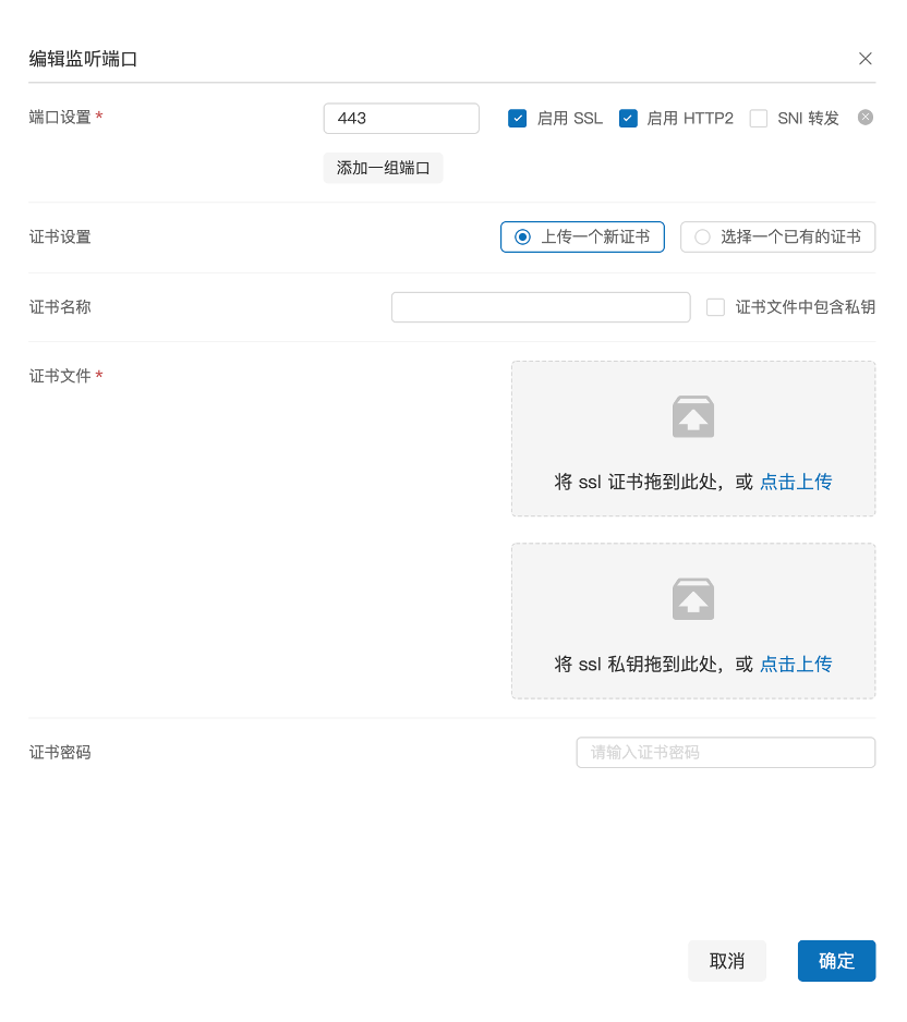 - 监听端口:可配置多组端口,选择端口是否启用SSL、HTTP2、SNI转发。并对应进行证书的配置。