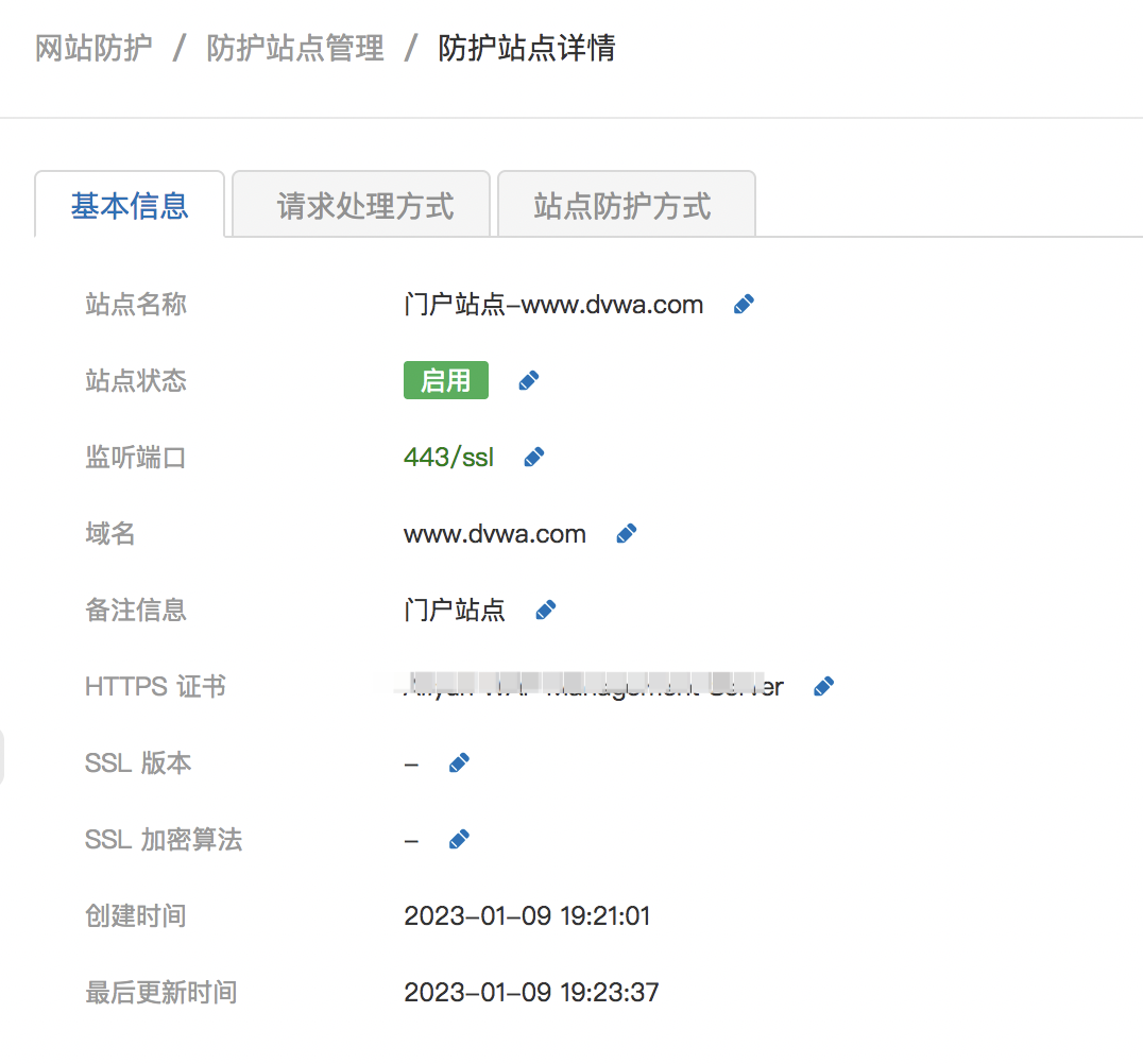 可对名称、站点启用禁用状态、监听的端口、域名、备注信息,(当处理HTTPS流量时可对)HTTPS证书、SSL版本、SSL加密算法等进行配置。并查看站点创建和最后更新的时间。