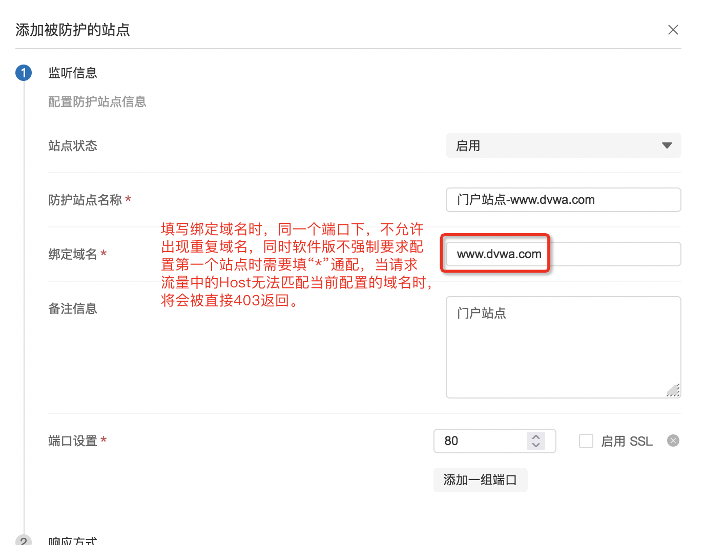 - 域名:监听端口上匹配的域名,所有经过已配置的端口匹配为该域名的流量都将进行后续的处理。此处支持填写IP或域名。