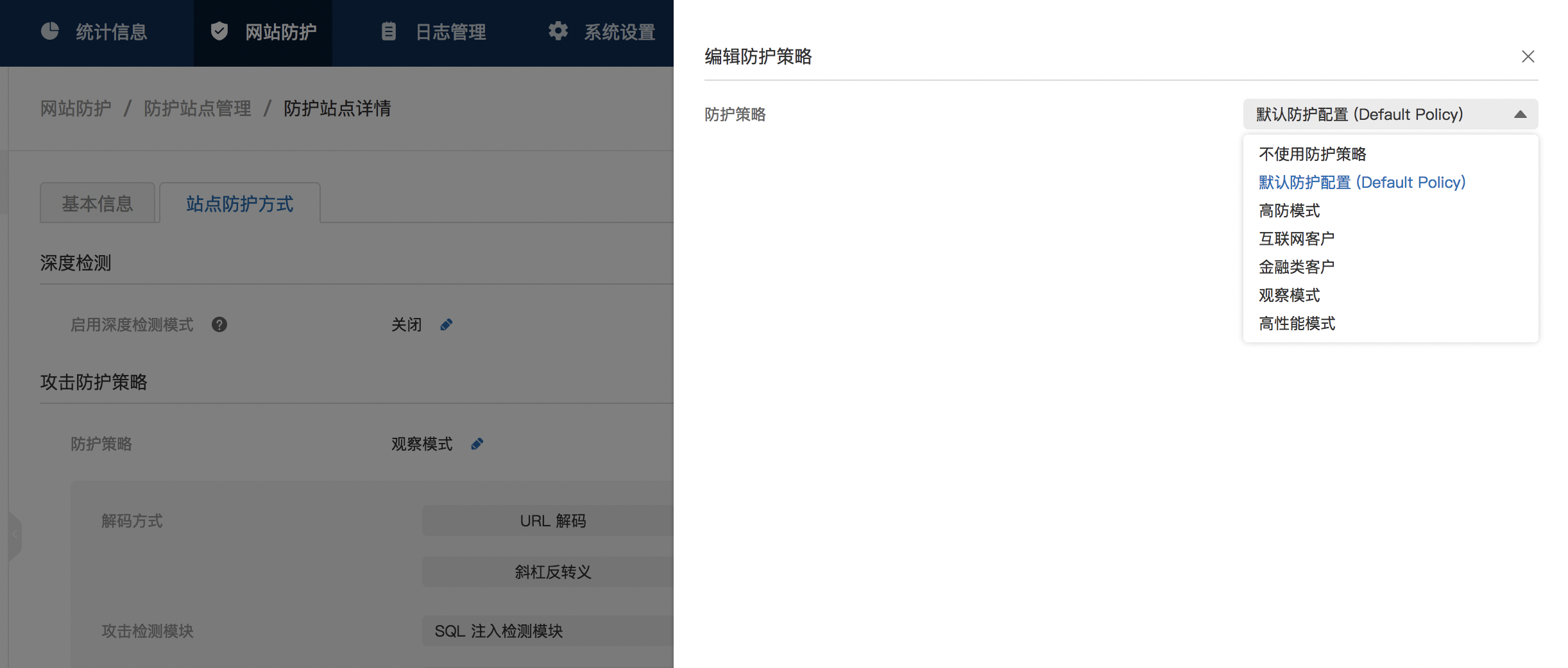 点击“网站防护”>“防护站点管理”, 编辑站点,将防护策略 改为 默认防护策略。