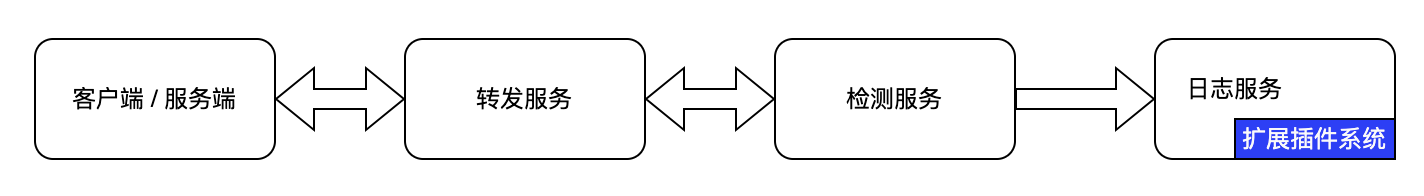 雷池 WAF 的流量检测的运行逻辑大致如下,客户端与服务端之间的流量会在经过转发服务时被劫持然后发送到检测服务,检测服务在检测完成后会回复给转发服务一个 “是否拦截” 的结果,同时检测服务还会将这一次的检测信息与流量的一些信息发送至日志服务,日志服务会异步于检测过程对检测信息做加工,Lua 扩展插件也运行于此处。