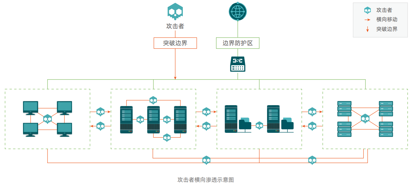 上述攻击步骤将夹杂在南北和东西流量中,由于企业内部信息资产间的流量交互更为复杂,因此东西向流量较南北向流量更难以管控。攻击流量藏身于正常的业务交互流量中,安全运维人员需要大量的时间分析、定位、溯源,于是攻击者利用事件处置窗口期完成后渗透阶段工作,给彻底清除隐患造成极大的困难。