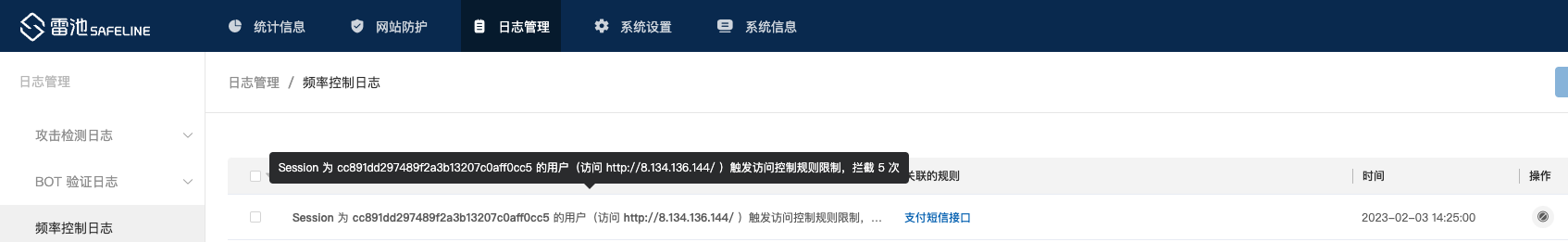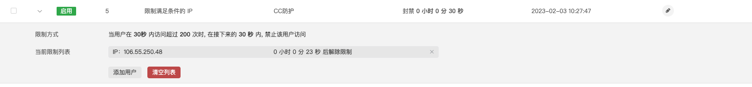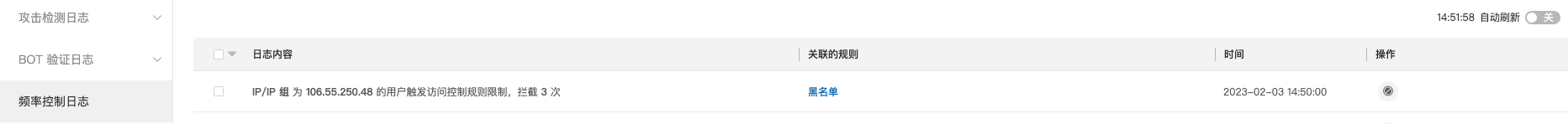 可点击当前设置的访问频率控制策略,查看当前IP封禁时间还剩下多少。