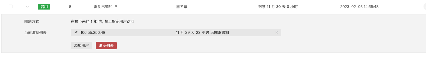 需要直接配置黑名单封禁可疑ip,触发方式需要选择已知用户,需要填写IP列表,也可直接选择已有IP组。黑名单配置限制时间,建议把值填写长点,因为超过封禁时间后,该IP将会失效在限制列表中被移除。