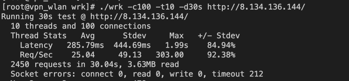 通过wrk来完成请求验证,可以看到在30s内发起了2450个请求。