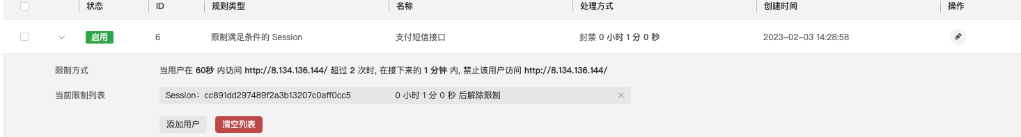 - 限制方式:将此用户在后续的限制时间按照该规则访问;