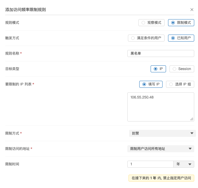 - 限制时间:主要控制触发限制的条件用户,在多长时间内一致生效。当超出该时间后,便可恢复正常,直到下次触发限制的条件;