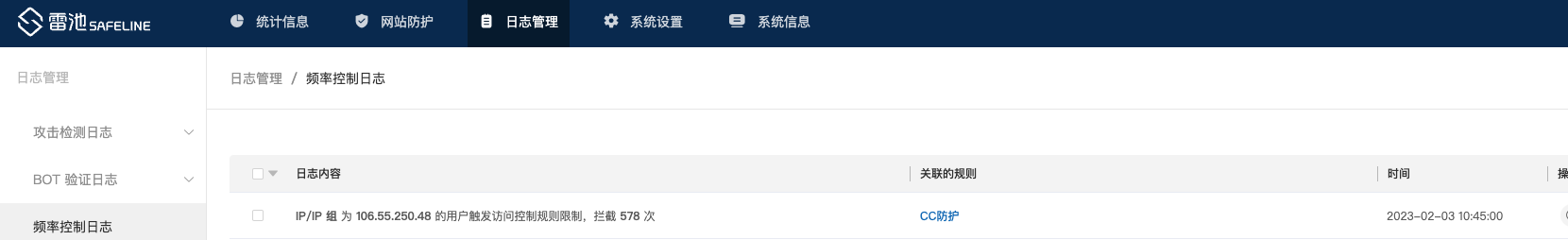 拦截日志,可以很明确的看到当前IP被拦截578次,因为我们设置的封禁30s所以这30s内再次访问都会被拦截,拦截次数会不断累积。