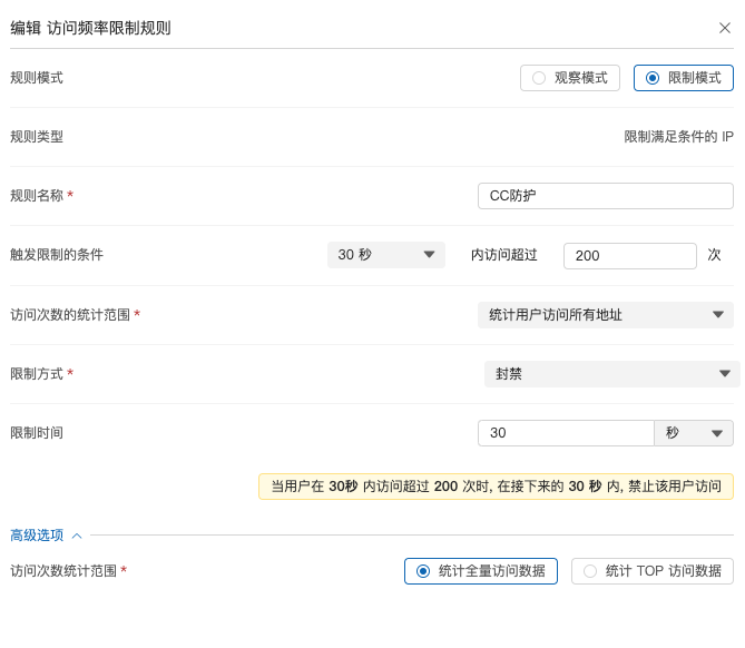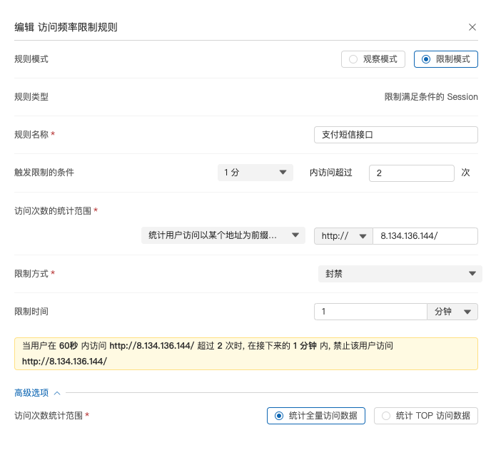 - 访问频率控制规则分为限制模式和观察模式两种规则模式,限制模式为限制满足访问控制规则的请求;观察模式为对满足访问控制规则的请求信息进行日志记录。