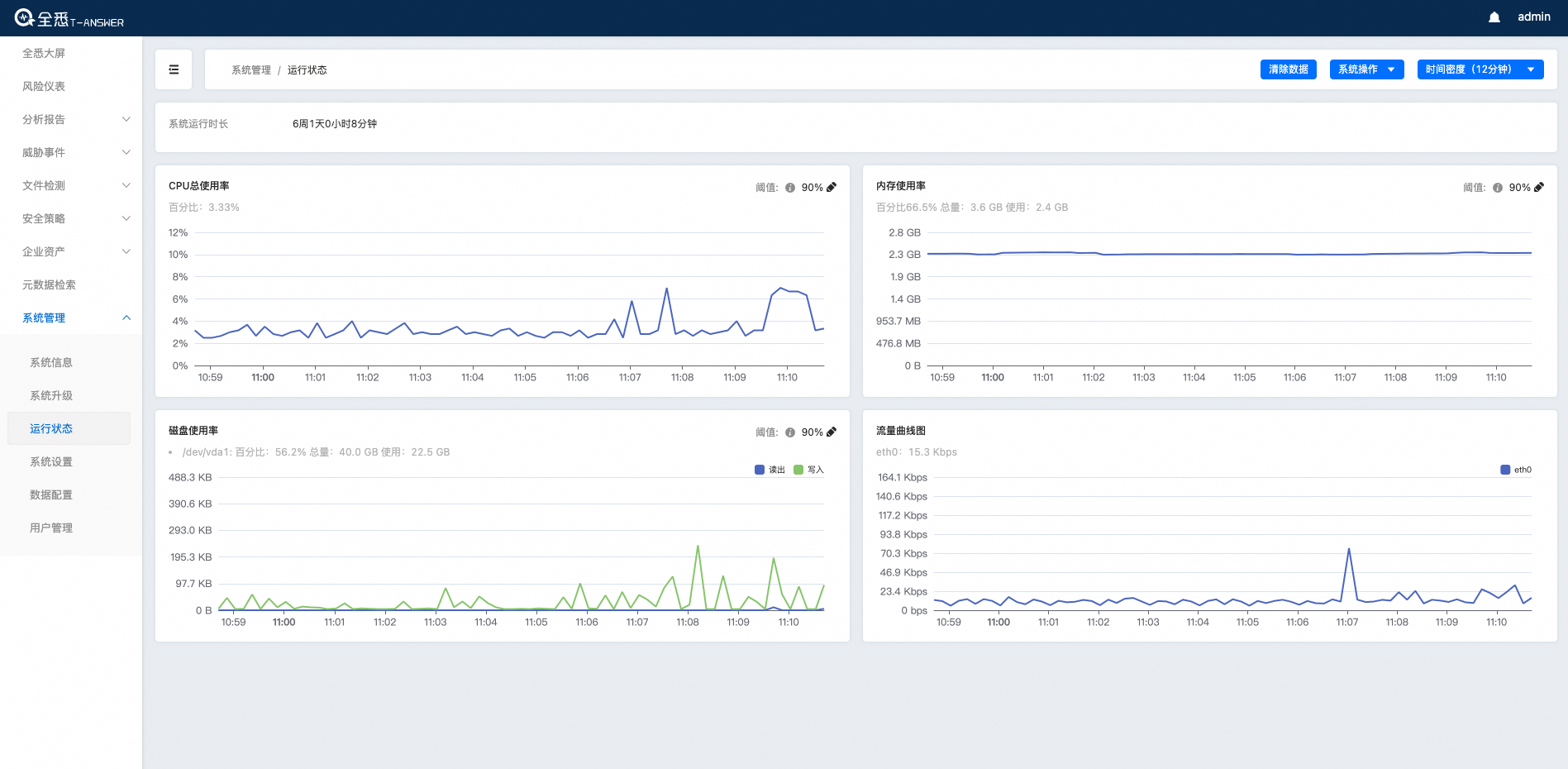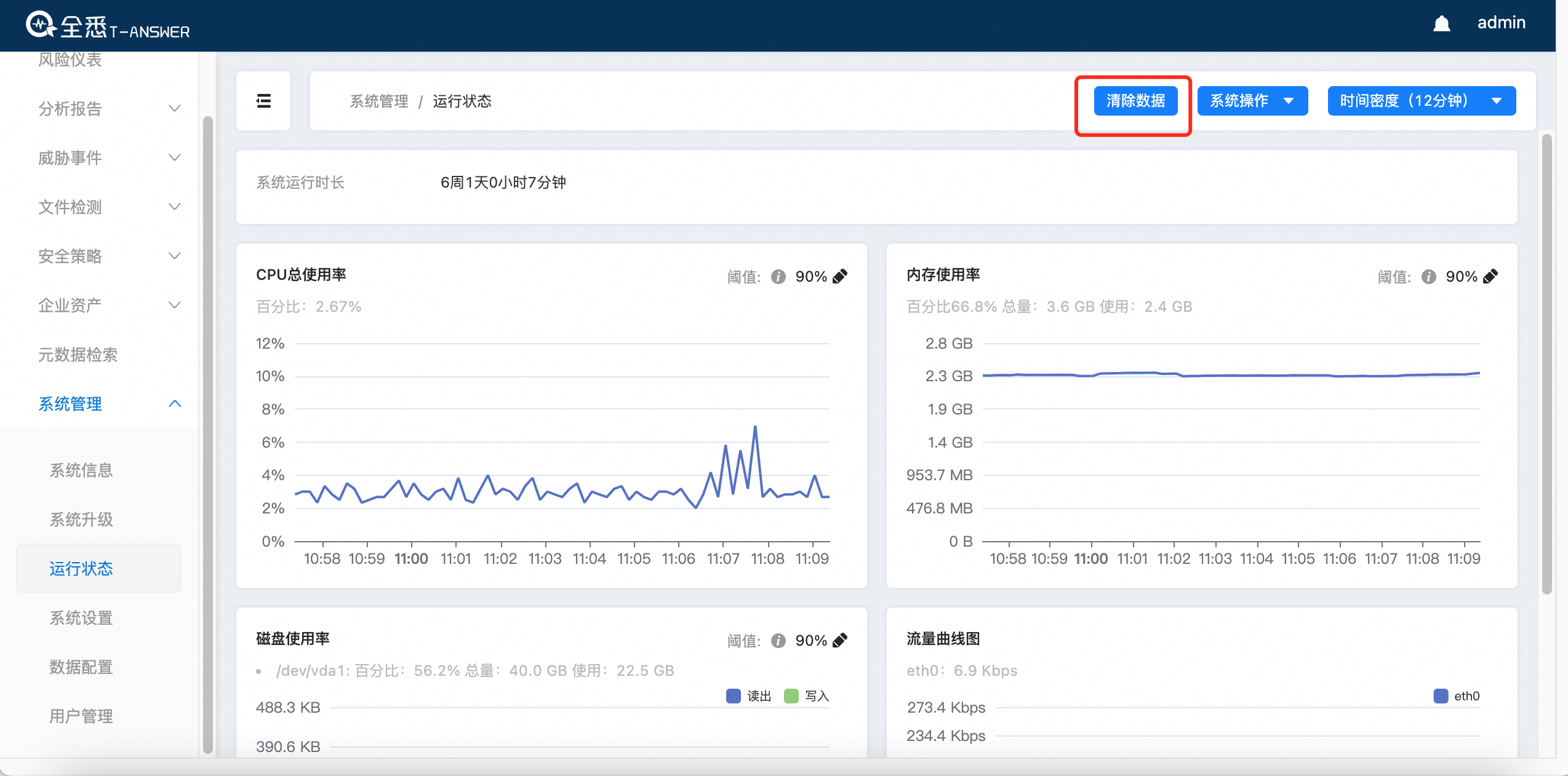 清除数据:在客户现场测试结束后,有清除数据需求。可登录系统进入【系统管理】-【运行状态】选择清除数据。系统将清除所有因监听流量而产生的所有数据(协议解析数据、文件数据、告警日志、文件报告)。