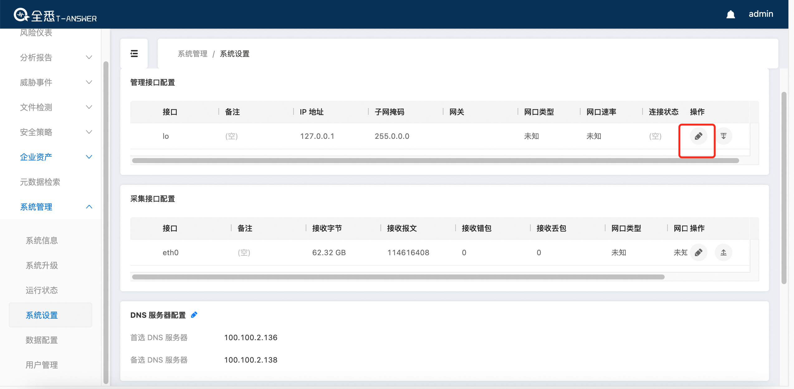 - 登入到系统后点击导航【系统设置】进入“管理口配置”模块,修改管理配置系统访问IP,正确填写IP、网关、子网掩码和DNS。