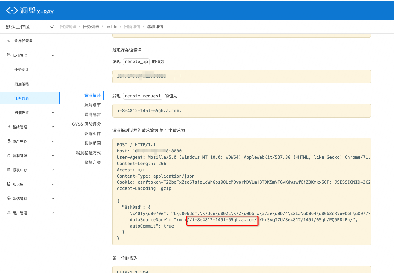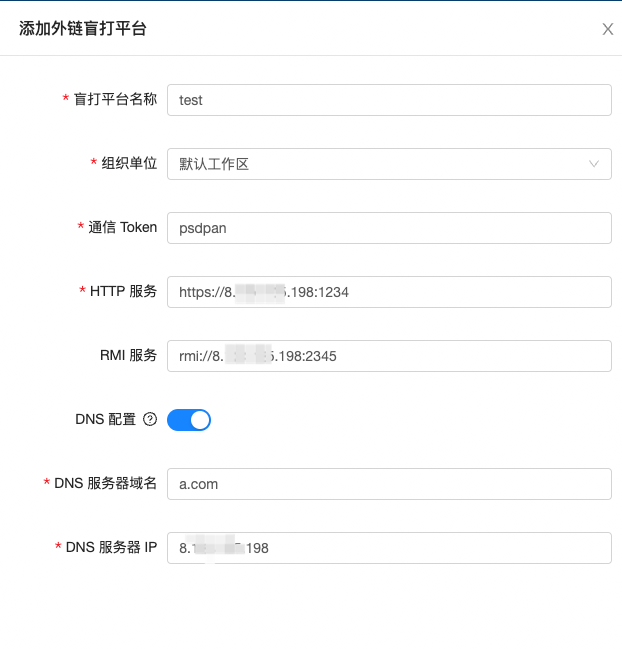 - 在洞鉴控制台上,“扫描管理-扫描配置-全局配置”处,添加外链盲打平台,并将2中设置的http、rmi、dns和token按规定格式填写并保存;