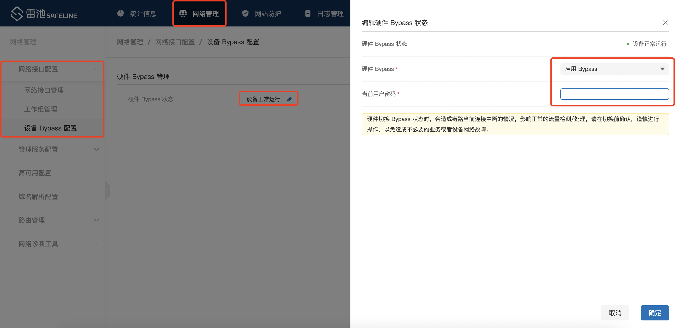 - 1)在雷池管理界面的【网络管理】-【设备Bypass配置】-【硬件Bypass管理】中开启硬件Bypass