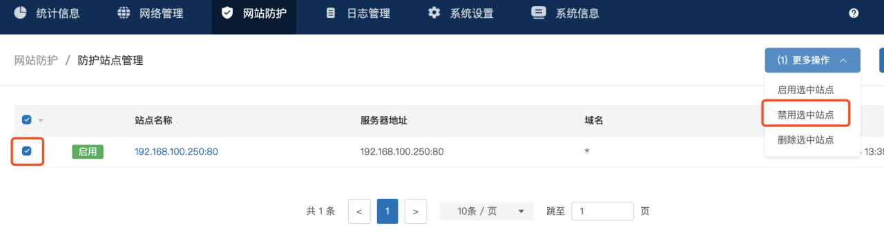 在雷池【网站防护】-【防护站点管理】中禁用异常的站点,或全选禁用所有站点