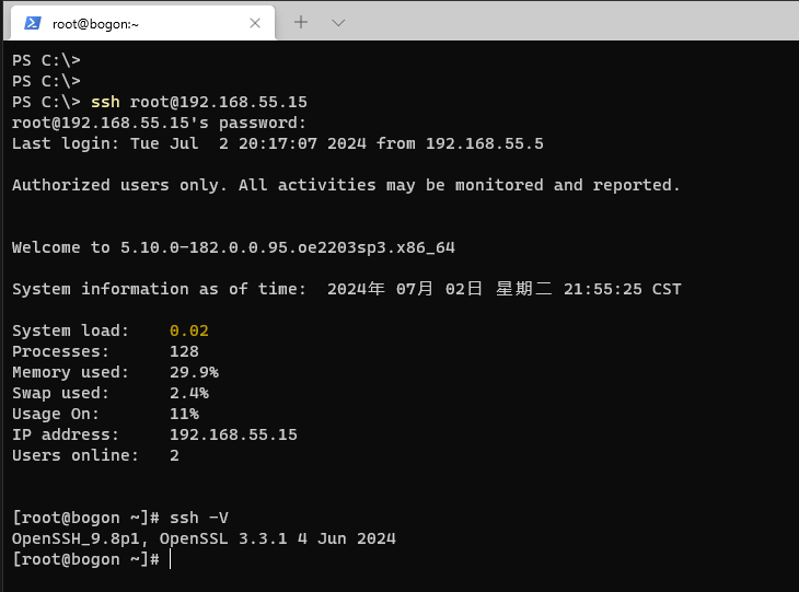 [root@bogon openssh-9.8p1]# cp -rf /usr/local/src/ssh/bin/ssh /usr/sbin/ssh