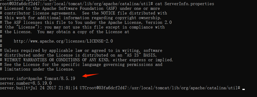 命令:cat /usr/local/tomcat/lib/org/apache/catalina/util/ServerInfo.properties