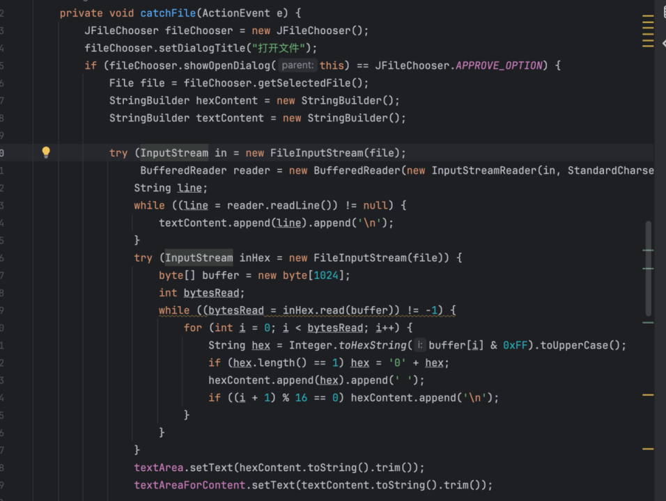 加入if语句,判断用户是否确定打开该文件,如果该文件允许打开,则构建16进制内容和普通文本内容(StringBuilder)