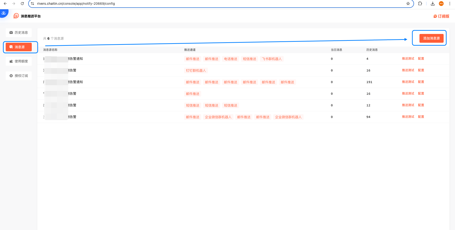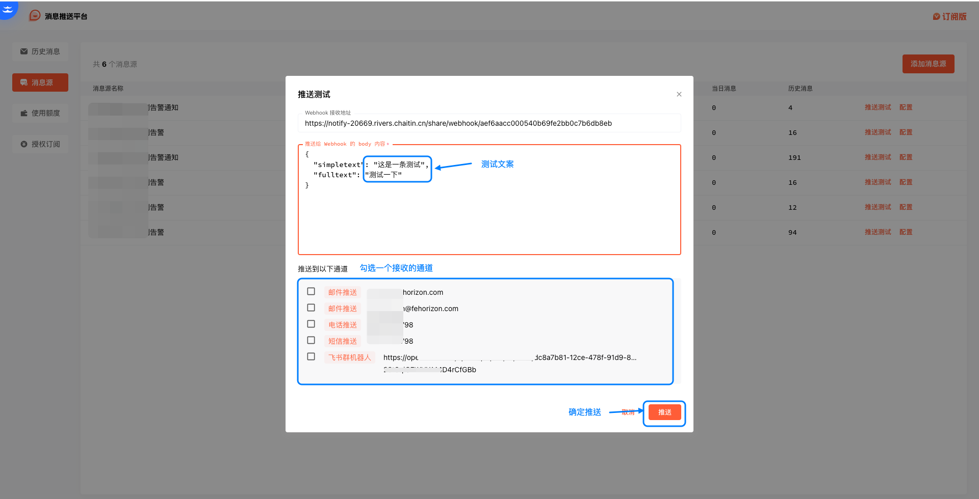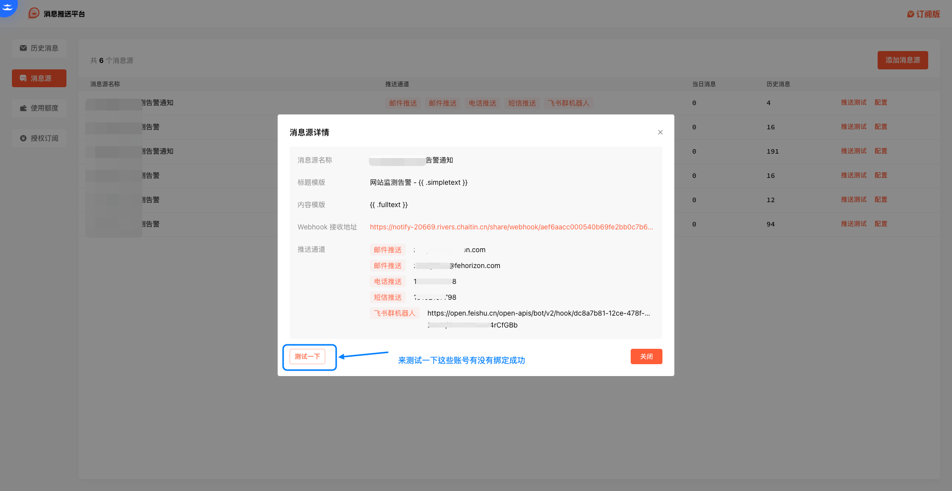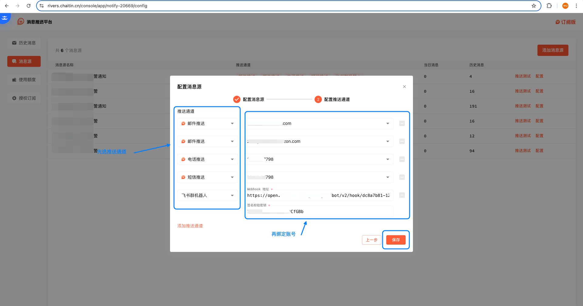 配置消息渠道,先选择推送通道,然后输入对应的账号去绑定,绑定完成之后点击保存。