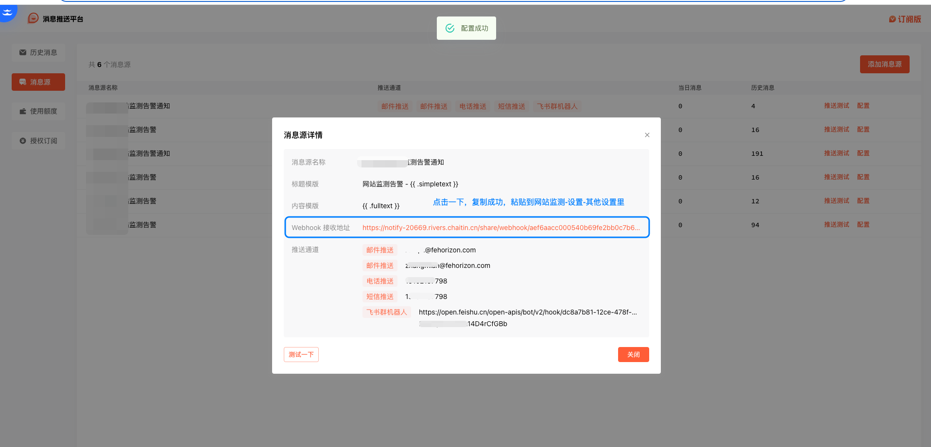 7.打开网站监测-设置-其他设置,把刚才复制的“webhook 接收地址”粘贴上,就完成啦 ✅