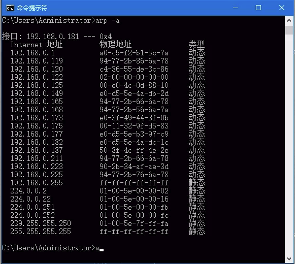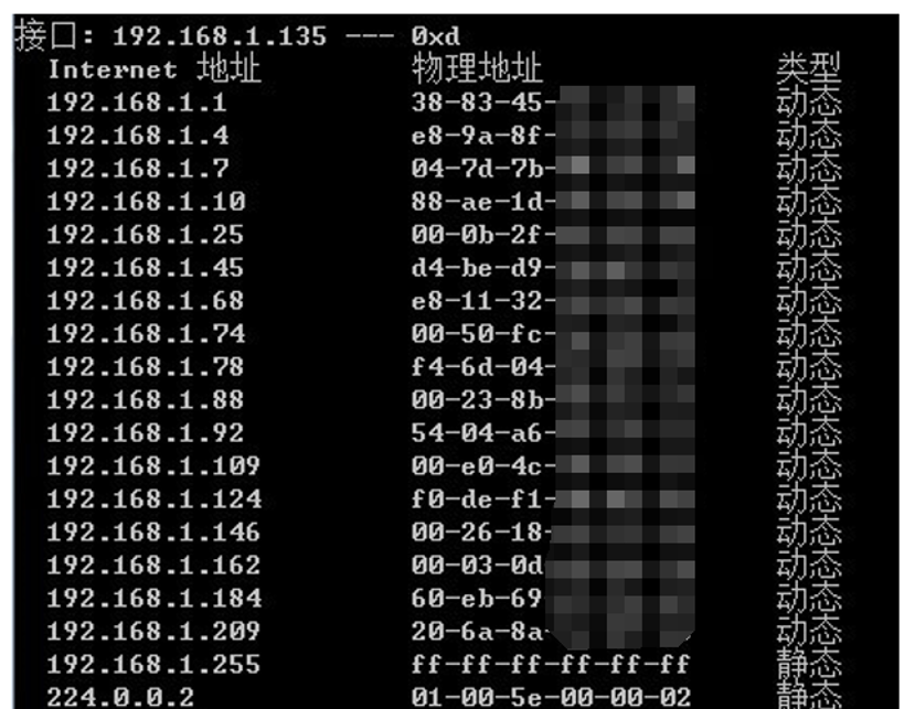3、可以查到和PC所在同一个局域网中和PC通信过的所有设备的IP-MAC对应信息,再核对机身上MAC地址即可找到IP。