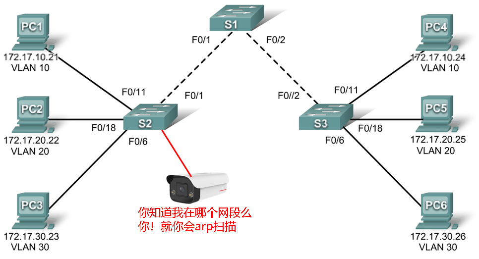 上述3种手段都是通过ARP扫描和电脑同网段的设备去找它的IP地址,那如果在三层VLAN网段下,你不知道它所在的VLAN和网段是什么,那怎么找?