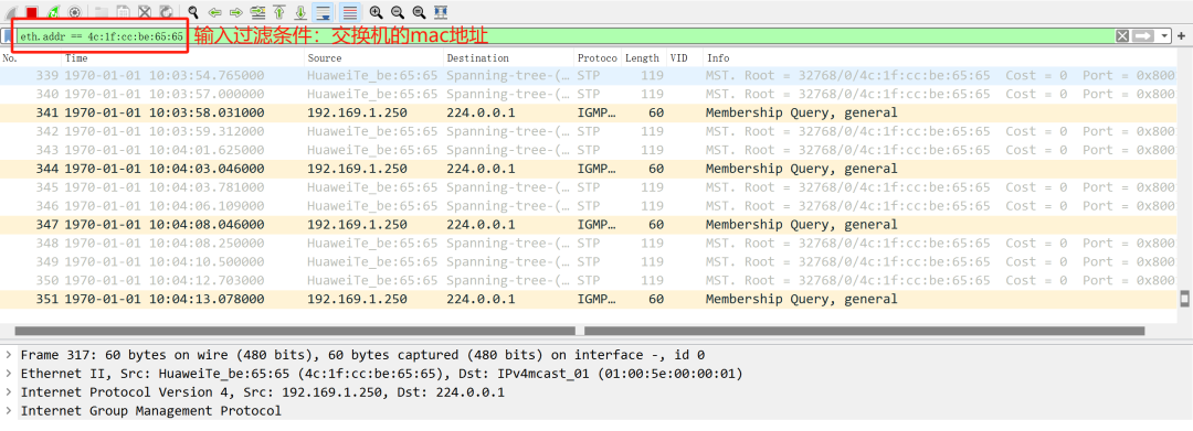 是个有IP的管理型网络设备基本都会说话的,也就是它必然会发包,直接wireshark抓包。比如要查上图交换机的未知IP,步骤如下: