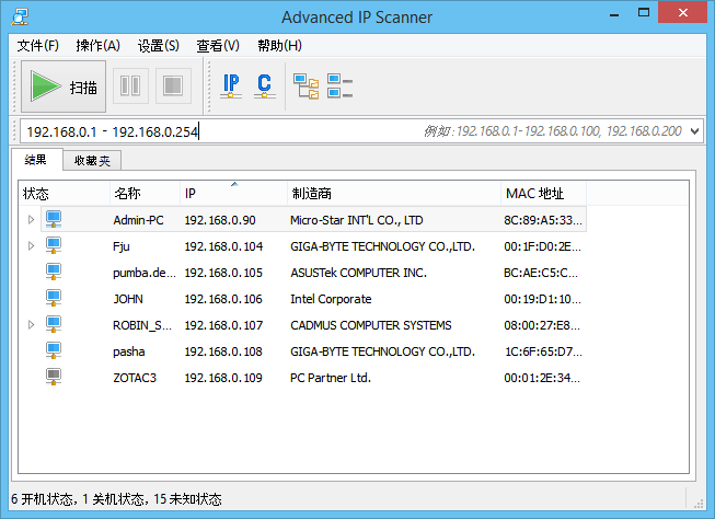 推荐几款,比如:科莱MAC扫描器、Advanced IP Scanner、NetBScanner都是脚本小工具,网上都有下载。原理是基于同网段的ARP扫描识别局域网中的设备,同时使用Net BIOS协议去解析扫描到设备的相关名称信息,输出结果为mac、IP、主机名称、厂商等等信息,显示如下: