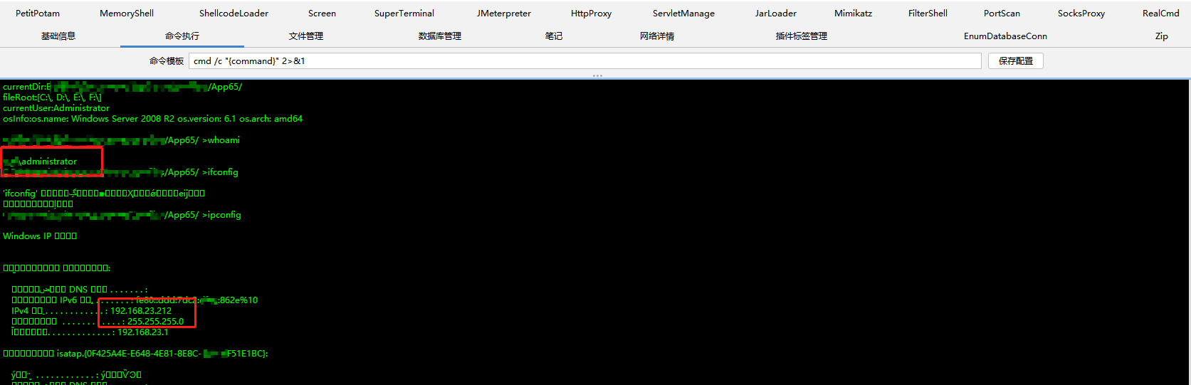 利用mimikatz插件也成功地获取了管理员明文密码,下一步就是进行内网横向移动扩大战果了。