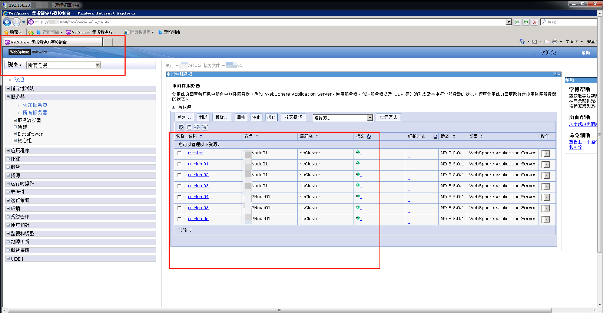 可以发现,这台websphere服务器集中管理平台管理内网7台服务器节点