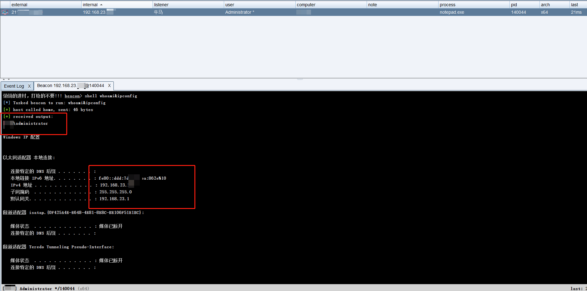 考虑到后续的内网横向渗透,我通过上传的WebShell又上线了Cobalt Strike (CS) 木马。尝试了多种提权技术(如DLL注入、服务提权等)来提升权限,最后成功获取了系统的最高权限。