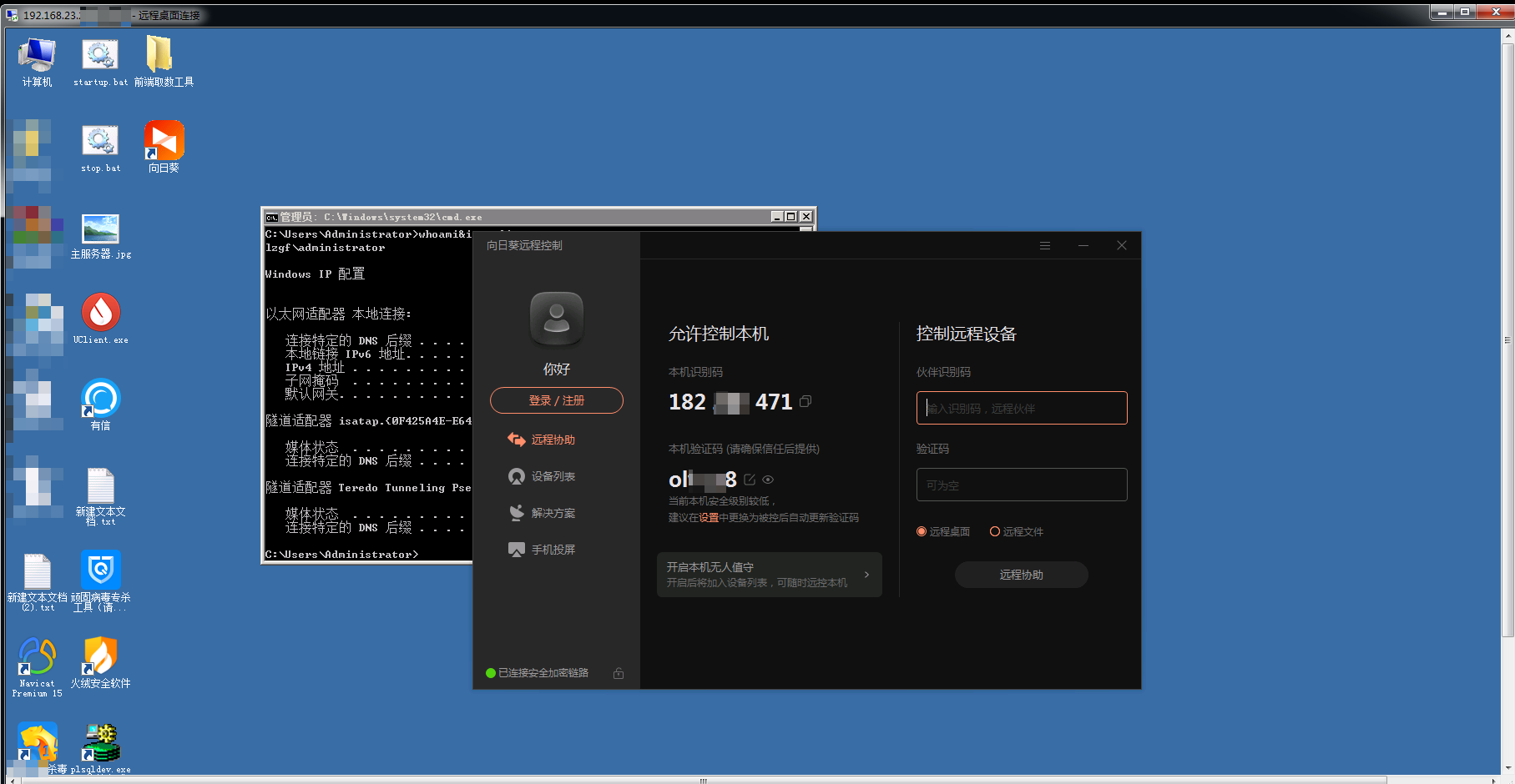 但是登录桌面后发现目标已经安装了向日葵远程管理软件,为了隐蔽操作,故将todesk进行卸载,使用目标的向日葵进行远程操作。这一步骤帮助我们避免了被目标系统管理员发现的风险。