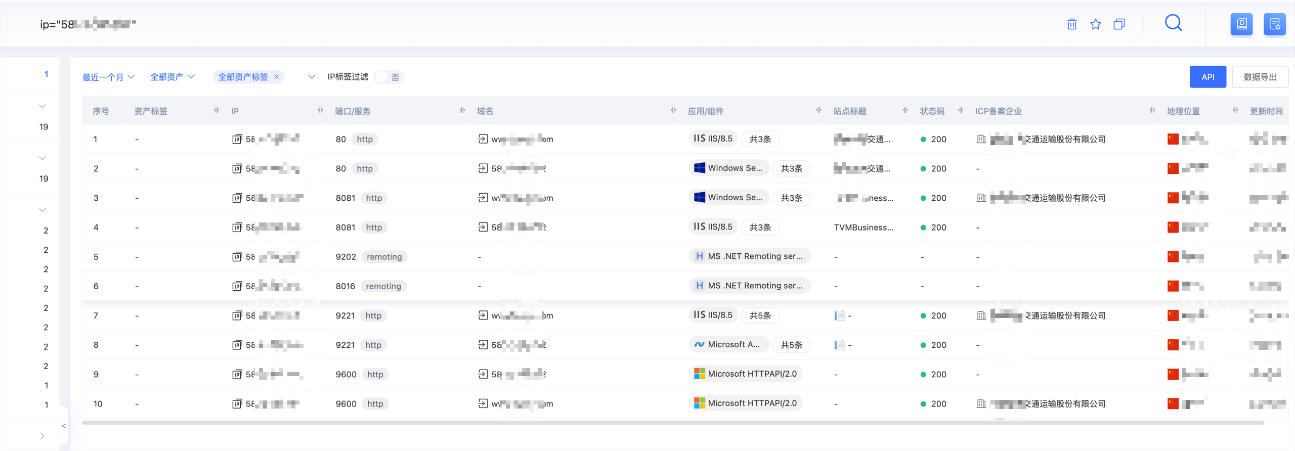 接着利用网络空间测绘平台拓展攻击面,我比较喜欢利用鹰图平台(网络空间测绘平台)对目标企业进行资产扫描,快速检索出企业的业务系统及其子公司的相关资产。鹰图平台提供了丰富的资产信息,包括域名、IP地址、开放端口、服务类型等,帮助我们全面了解目标企业的网络架构。尤其是通过ICP备案信息反查功能,发现了多个子公司的业务系统。