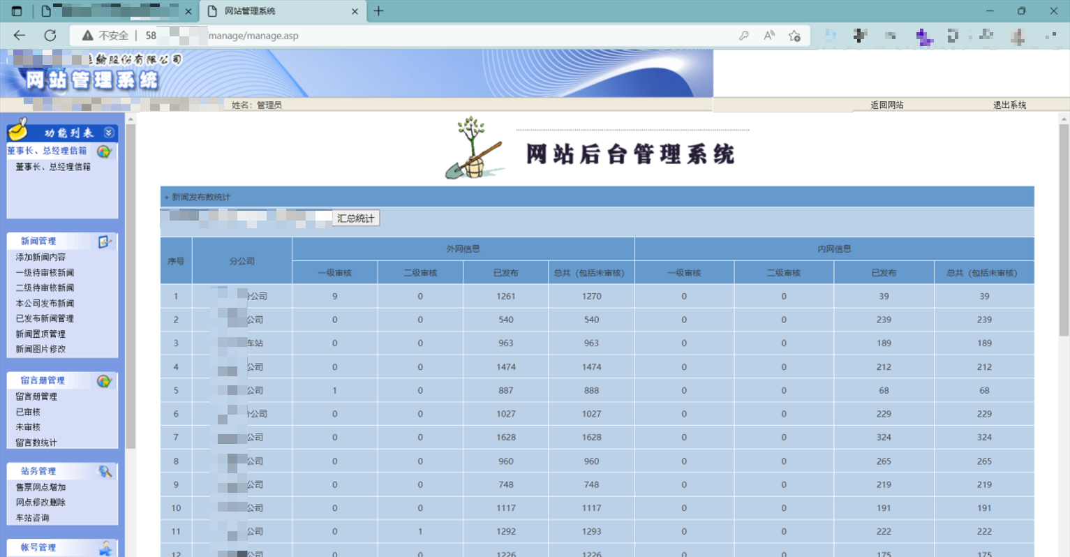 有意思的是,网站的最下方给出了管理后台的链接,这就免得我们使用御剑去爆破后台路径了。使用上面获取的管理员账号和密码成功登录了新闻发布系统的后台管理界面。在后台中,我们发现了一些敏感信息和功能模块,为进一步的渗透提供了便利。